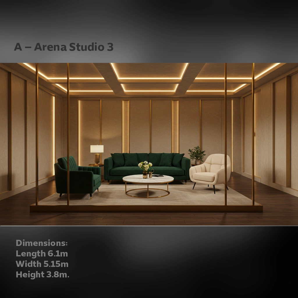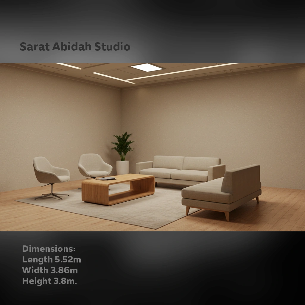 أجواء صوتية نقية تم تصميمه خصيصًا للبودكاست والبرامج الصوتية، مزود بعزل صوتي عالي الجودة ومعدات تسجيل احترافية.