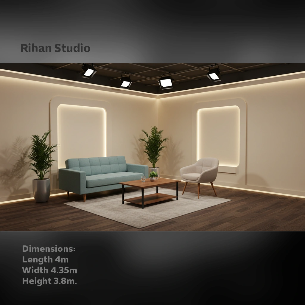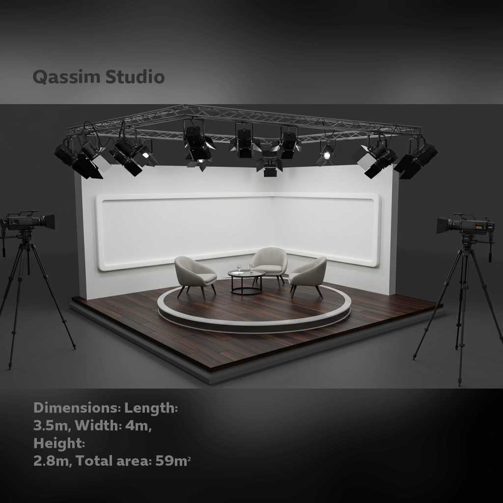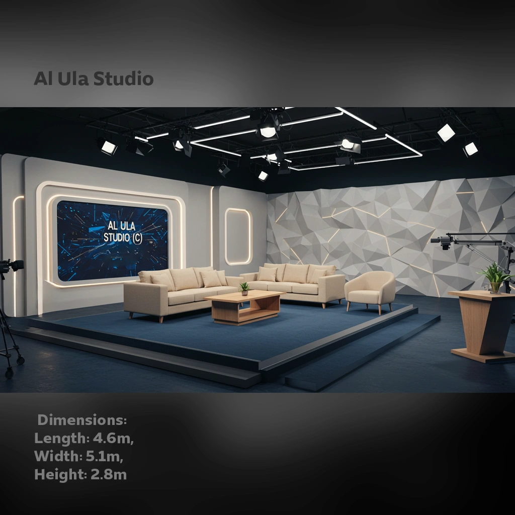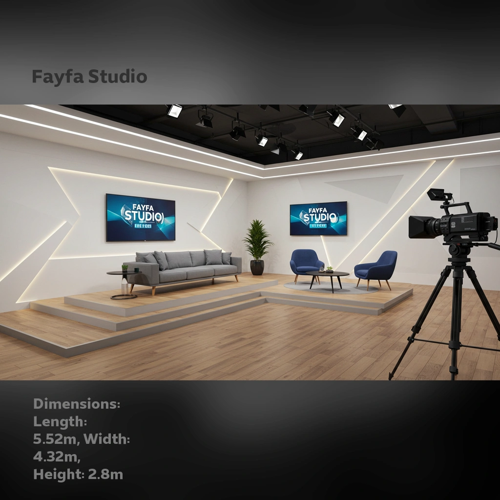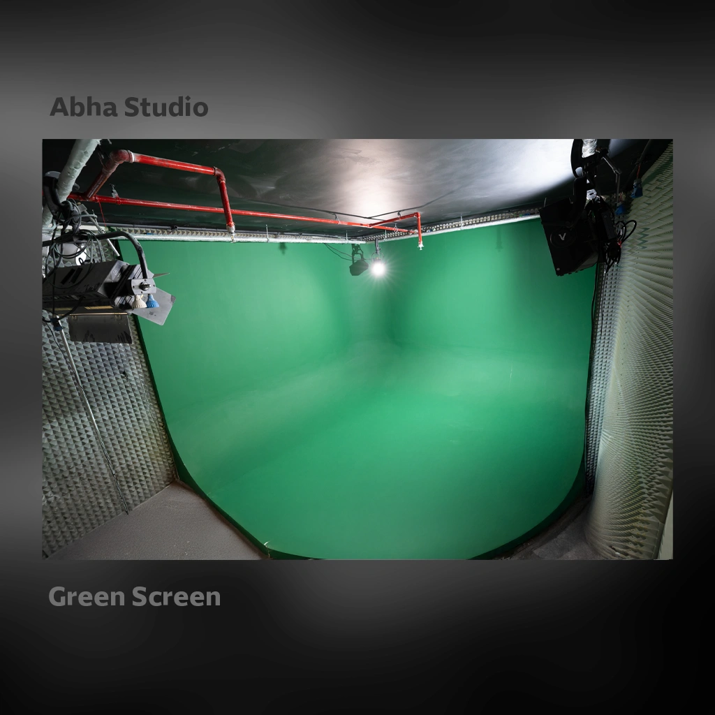 استوديو إبداعي ببيئة افتراضية مجهز بتقنيات الشاشة الخضراء (Chroma) لإخراج احترافي ومرونة في تصميم المشاهد.